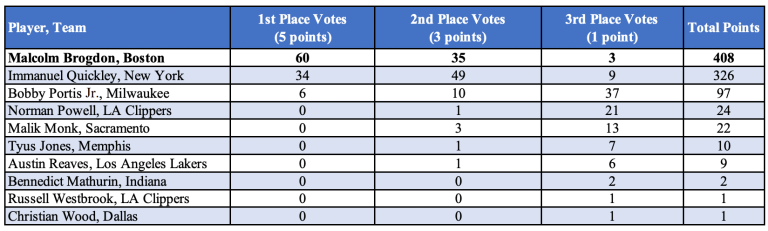 Wśród trzech finalistów byli Malcolm Brogdon z Boston Celtics, Immanuel Quickley z New York Knicks i Bobby Portis z Milwaukee Bucks. Ostateczna rywalizacja miała się stoczyć pomiędzy Brogdonem oraz Quickleyem, bowiem obaj przez cały sezon prezentowali wybitną formę jako wsparcie z ławki. Zawodnik Celtics w 60 ze 100 arkuszy głosujących znalazł się na 1. miejscu. Wyprzedził swojego głównego konkurenta o 82 oczka. To pierwsza taka nagroda w karierze Brogdona.